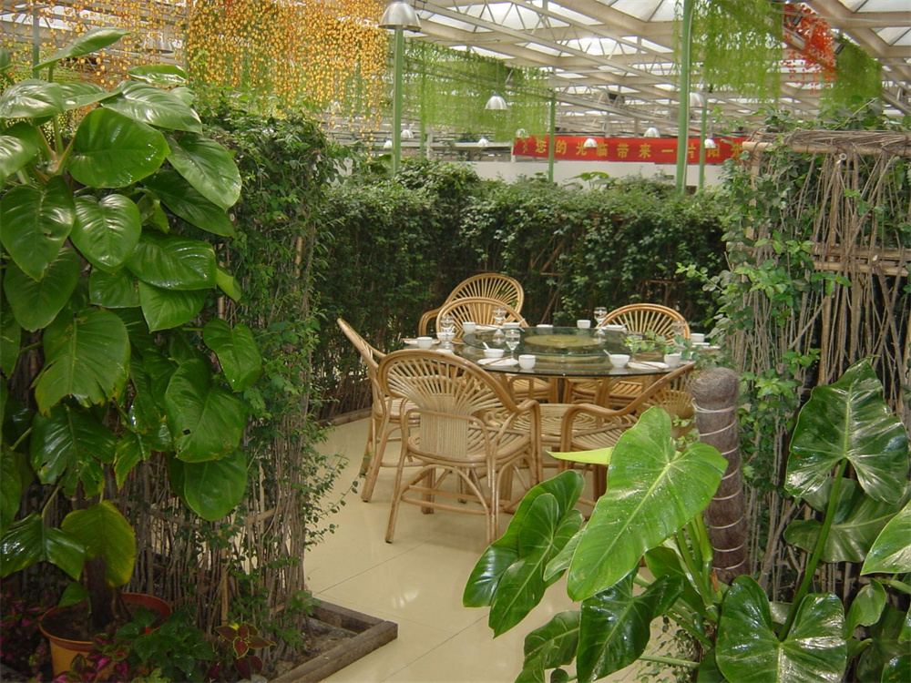 它綜合運用建筑學(xué)、園林學(xué)、設(shè)施園藝學(xué)、生態(tài)學(xué)等 相關(guān)學(xué)科知識進行規(guī)劃、設(shè)計和建設(shè),以設(shè)施調(diào)控技術(shù)、農(nóng)藝栽培技術(shù)來維護餐廳的優(yōu)美環(huán)境,形成以綠色景觀植物為主,蔬果、花草、藥菌為輔的植物配置格局,結(jié)合假山、小橋流水、竹木亭閣的園林景觀,為就餐者提供綠色、優(yōu)美、舒適、悠閑、宜人的就餐環(huán)境,使的溫室具有餐飲功能、觀賞功能、休閑功能、娛樂功能、綠色食品推廣功能、節(jié)能環(huán)保功能等。