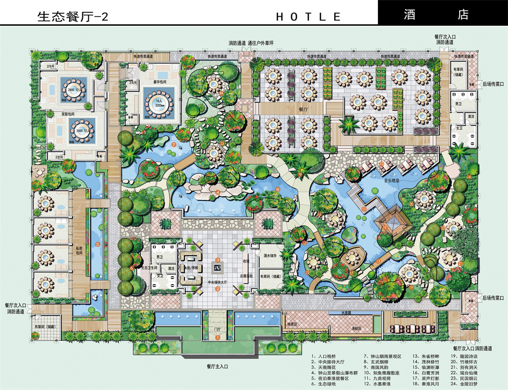 它綜合運(yùn)用建筑學(xué)、園林學(xué)、設(shè)施園藝學(xué)、生態(tài)學(xué)等 相關(guān)學(xué)科知識進(jìn)行規(guī)劃、設(shè)計(jì)和建設(shè),以設(shè)施調(diào)控技術(shù)、農(nóng)藝栽培技術(shù)來維護(hù)餐廳的優(yōu)美環(huán)境,形成以綠色景觀植物為主,蔬果、花草、藥菌為輔的植物配置格局,結(jié)合假山、小橋流水、竹木亭閣的園林景觀,為就餐者提供綠色、優(yōu)美、舒適、悠閑、宜人的就餐環(huán)境,使的溫室具有餐飲功能、觀賞功能、休閑功能、娛樂功能、綠色食品推廣功能、節(jié)能環(huán)保功能等。